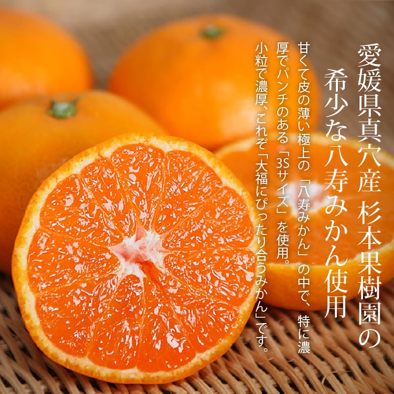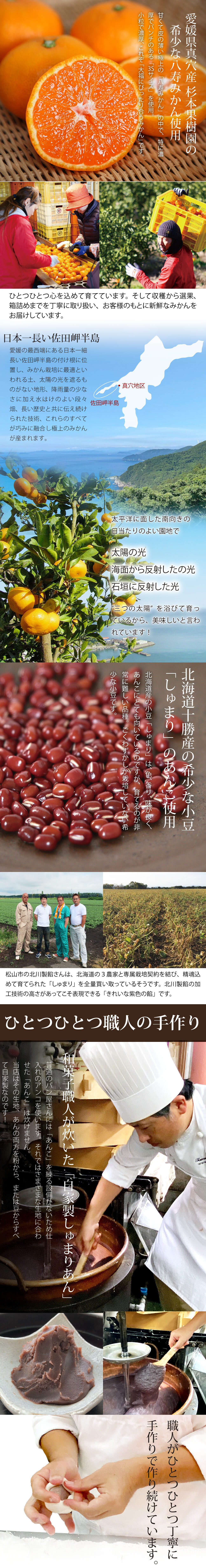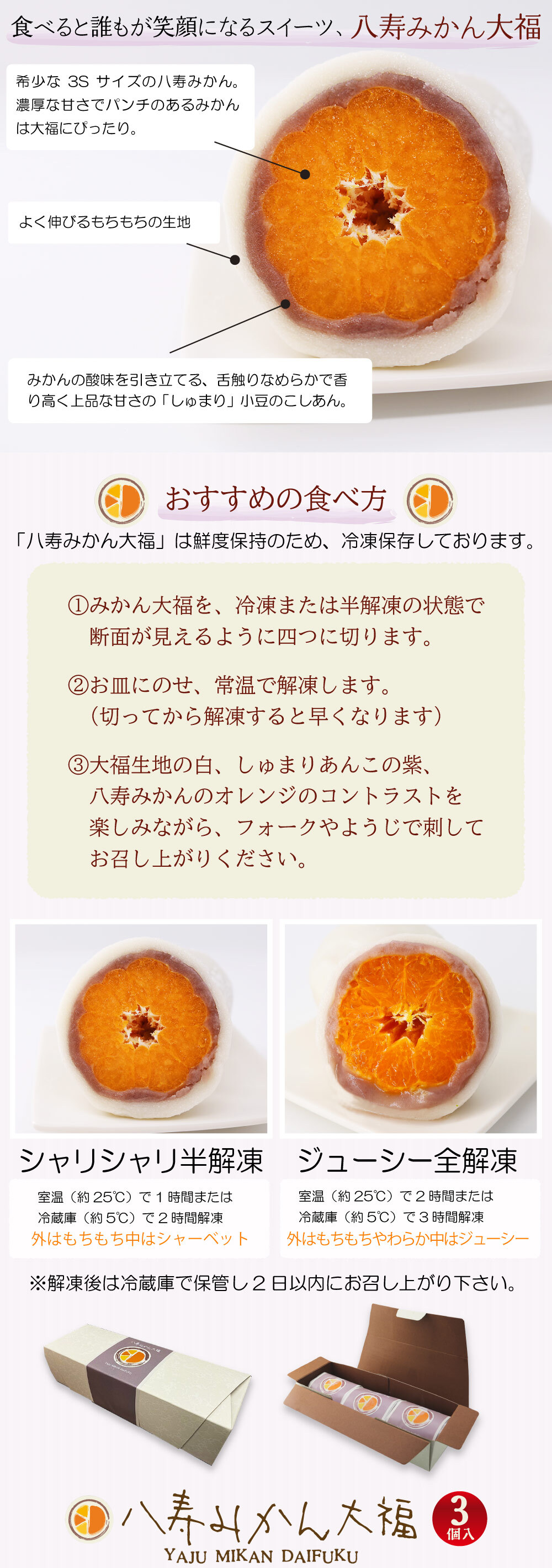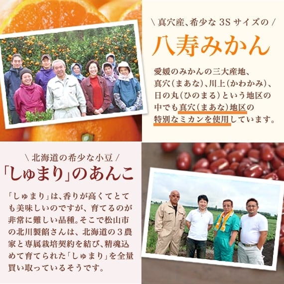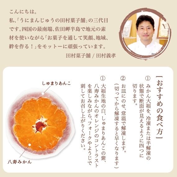 甘くて皮の薄い極上の「八寿みかん」の中でも特に濃厚な味わいを誇る「3Sサイズ」を北海道産の「しゅまり」のあんこで包み込んだ贅沢な大福!