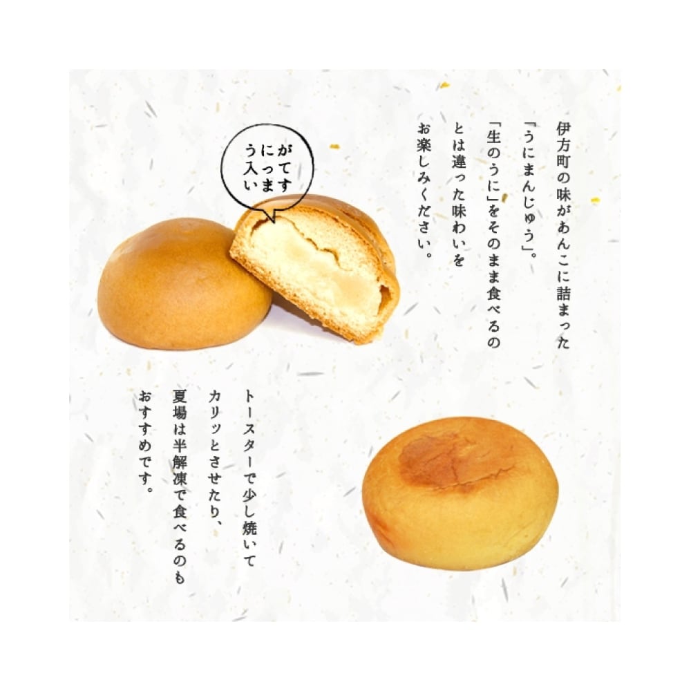 愛媛県佐田岬産にこだわった、ウニの風味がほのかにひろがるうにまんじゅう。