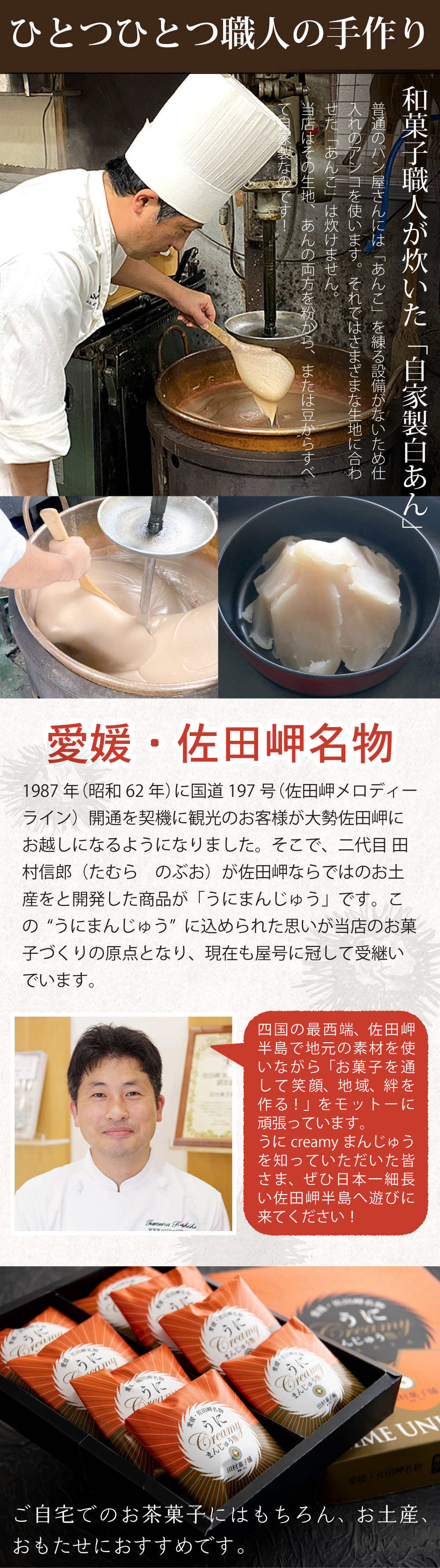 地元・佐田岬半島で採れた雲丹の風味が、あんこにほのかに広がる贅沢な和菓子。