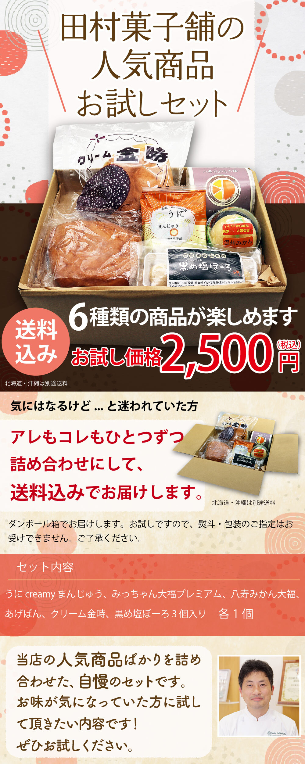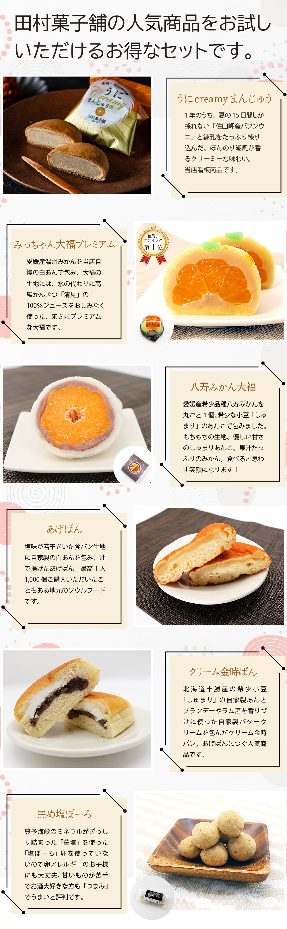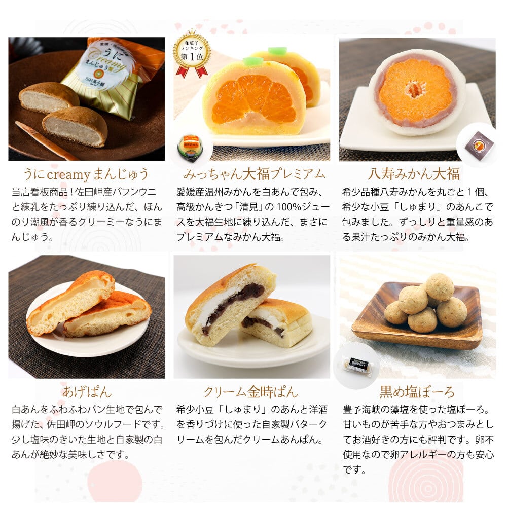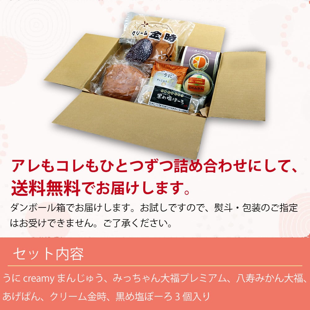 内容量:うにcreamyまんじゅう、みっちゃん大福プレミアム、八寿みかん大福、 あげぱん、クリーム金時、黒め塩ぼーろ3個入り(各1個)
