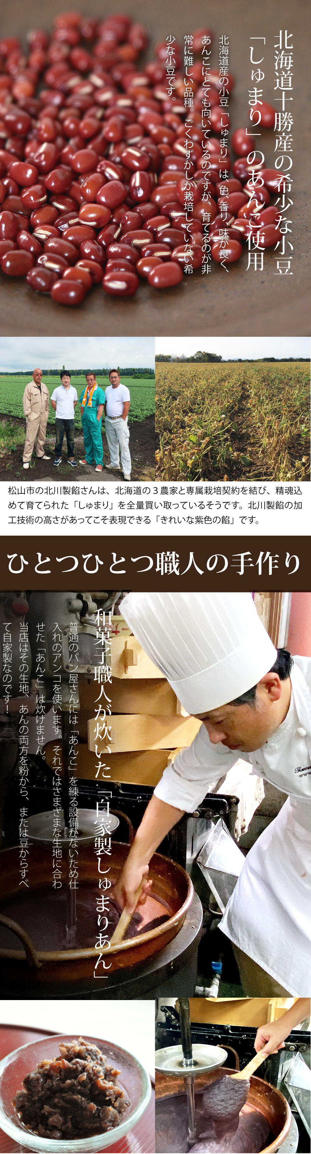 原材料:小豆(北海道産しゅまり小豆)、小麦粉、砂糖、食用植物油脂、食用精製加工油脂、卵、イースト、ラム酒、ブランデー、食塩/イーストフード、乳化剤、酸化防止剤(V.E)、香料